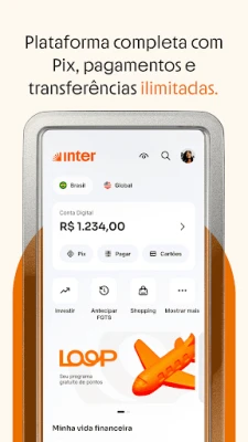 Pero **Inter** va mucho más allá de lo básico. Explora el mundo sin fronteras con una cuenta global en dólares, sin tarifas de apertura ni mantenimiento, y una tarjeta de débito internacional para tus viajes. Para los más jóvenes, ofrecemos la 'Conta Kids' para planificar el futuro y 'Inter You' para fomentar la independencia financiera. Gana beneficios con 'Inter Loop', un programa de puntos gratuito que puedes canjear por millas, descuentos o inversiones. Si buscas financiación, accede a opciones de préstamos personalizadas, desde hipotecarios hasta anticipo de FGTS. Además, maximiza tus compras en nuestro Shopping exclusivo con descuentos y cashback, protege lo que más te importa con nuestra plataforma de seguros, y mantente conectado con **Inter Cel**, que te ofrece la mejor cobertura y beneficios adicionales. Con **Inter**, todo lo que necesitas está en un solo lugar, simplificando cada aspecto de tu vida.