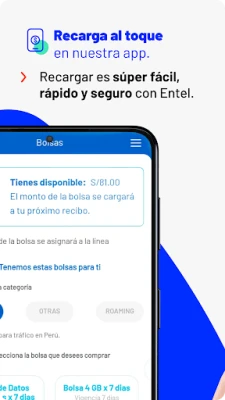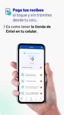 Gestionar tus finanzas móviles nunca fue tan sencillo. Con **Entel**, visualizar y abonar tus recibos está al alcance de tu mano, ofreciéndote una experiencia de pago segura y sin esperas. ¿Necesitas un extra de datos o minutos? Recarga saldo o adquiere nuevas bolsas de manera instantánea, adaptándote a tus necesidades en cualquier momento y lugar. Además, contribuye al medio ambiente y disfruta de la comodidad de la era digital al afiliarte al recibo electrónico, recibiendo tu facturación directamente en tu correo electrónico.