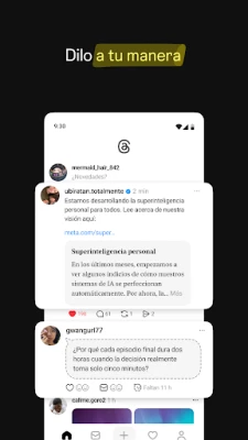 Sumérgete en Threads, la innovadora plataforma de Meta diseñada para encender diálogos y unir mentes afines. Es el epicentro donde las ideas cobran vida, desde los temas más candentes del día hasta las conversaciones que darán forma al mañana. Conecta sin esfuerzo al iniciar sesión con tu cuenta de Instagram, llevando contigo tu identidad verificada y tus conexiones más valiosas, o descubre nuevas voces para expandir tus horizontes.